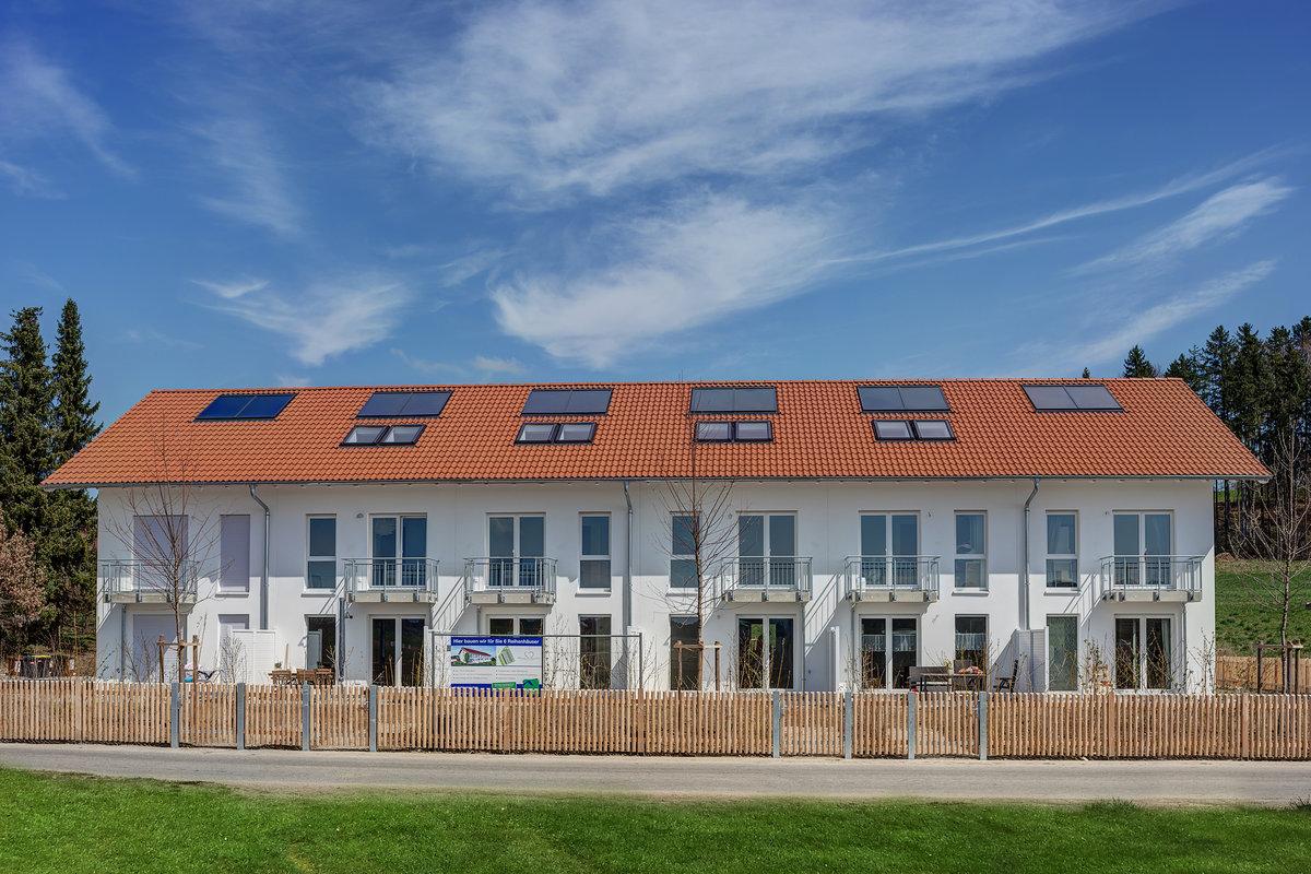Zu jedem Reihenhaus gehören eine Garage sowie ein Stellplatz im Freien.
